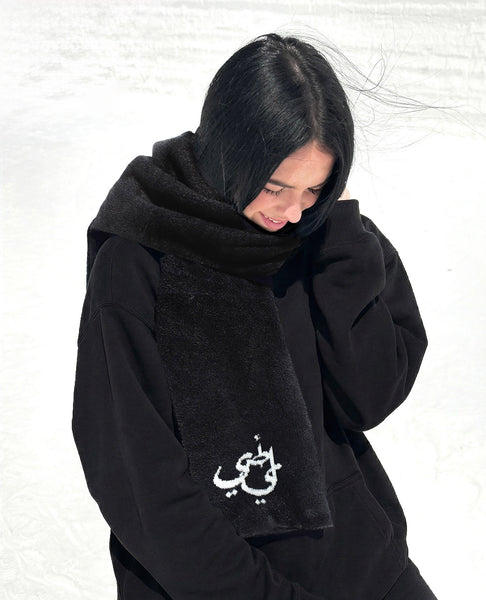 A soft fur scarf finished with the signature ASILI Arabic logo in white. Cozy, sleek, and a bold winter essential that pairs with any fit.