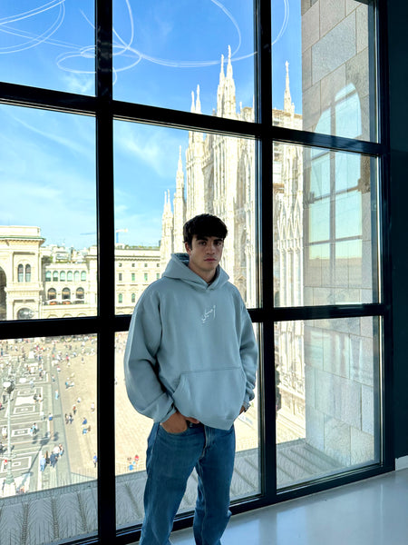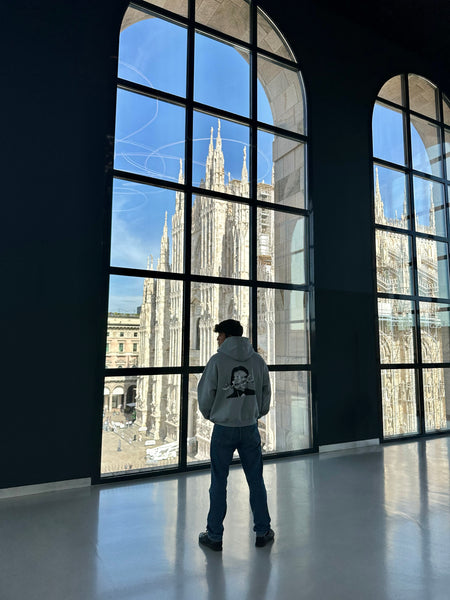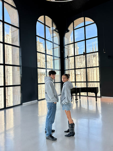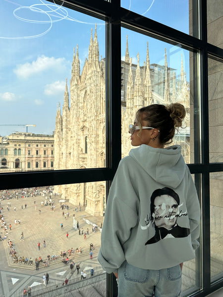 (Lasta Wahdak) لست وحدك hoodie comes in cloudy grey colour. The Hoodie features 2 of the most popular artists ; Abdelhalim Hafez the Egyptian singer as well as Micheal Jackson the American singer.The front of the hoodie is plain with a tiny white embroidery of the word “أصيلي”. Whilst the back is an illustration of both Artist Abdelhalim Hafez and Micheal jackson alongside each’s very famous song;