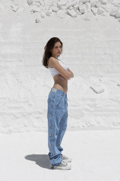 THE ASILI BUTTONED JEANS IN ICE BLUE is a low-rise, loose-fit jeans with buttons throughout the sideline of the jeans legs. From the front there are 2 slash pockets with the name “Asili” stitched under the left pocket in white.While from the back there are 2 patch pockets . The buttons on the side of the jeans can be opened or closed allowing you to change the fit of the pants.