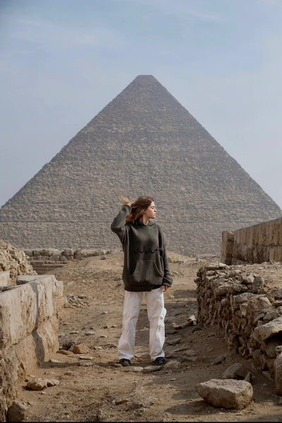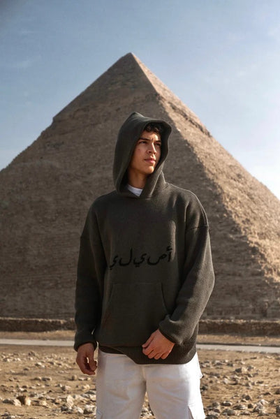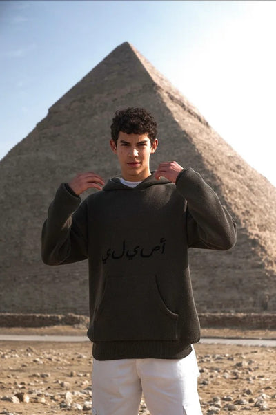 THE ASILI KNITTED COLLECTION ( Pyramids’ Coordinates Edition) in the color Olive Green is an oversized fit hoodie with a kangaroo pocket . The Asili Knitted Collection is different by which the hoodie is knitted . The Hoodie features the Coordinates of the Great Pyramids of Giza from the back . Whilst , the word "أصيلي" is knitted from the front