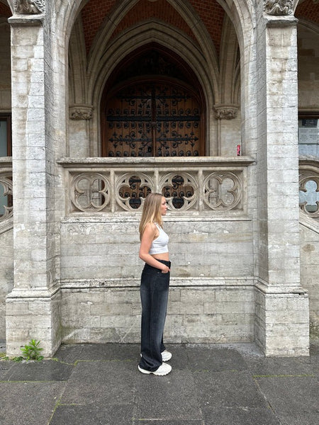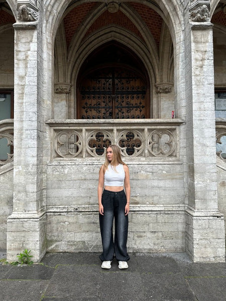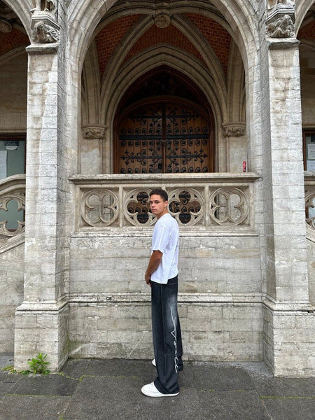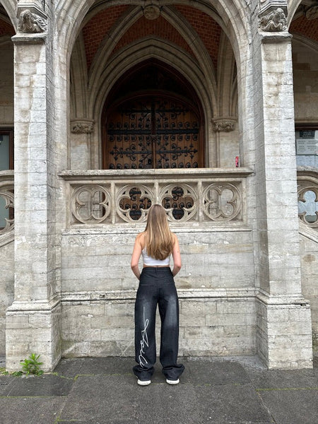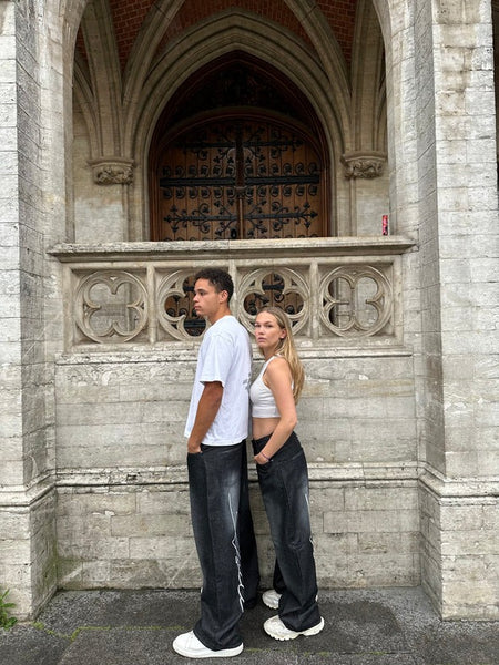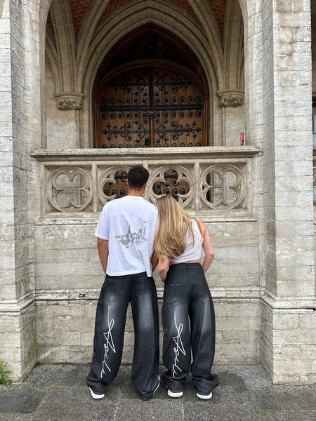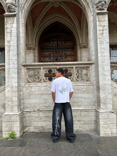 The Asili Mighty baggy jeans in black are baggy-fit jeans sprayed from the front and back in faded white. From the back on the left leg, the jeans have the word "Asili" stitched in white embroidery.