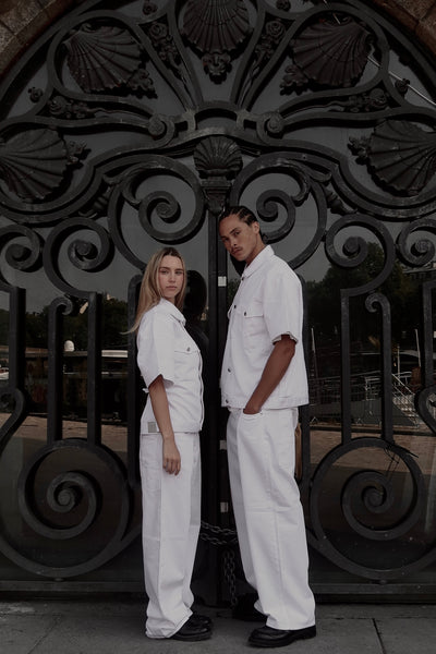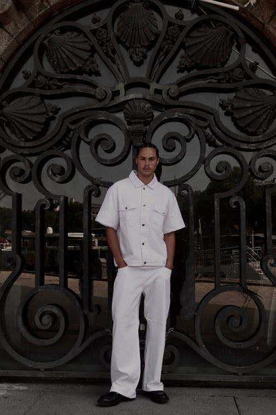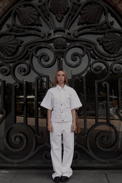 The Asili Parisian Coconut Jacket comes in the color coconut white. The Jacket blends timeless style with modern versatility. This short-sleeve jacket features a structured collar and two buttoned front flap pockets . An optional removable belt which allows for a tailored fit . The jacket also features a white laser-cut of the new Asili logo on the left pocket that adds a distinctive touch. Perfect for layering, bringing effortless sophistication to any wardrobe.