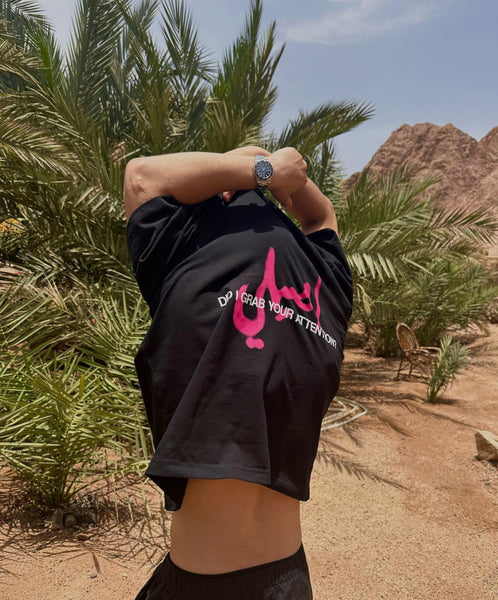 The ATTENTION SEEKER T-SHIRT is a black oversized short-sleeved t-shirt. The T-shirt has black embroidery of the word "أصيلي" on the front. While from the back there is a pink print of the word "أصيلي" and on top of it the statement "DID I GRAB YOUR ATTENTION?" in white.