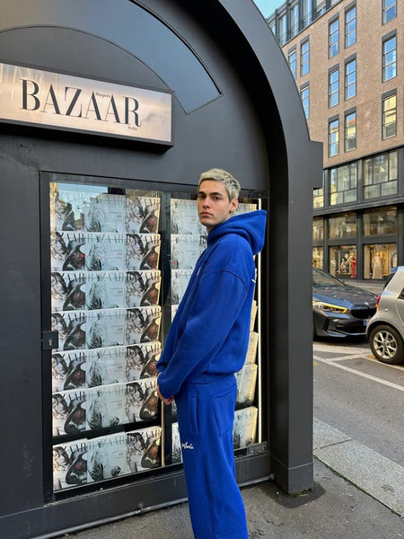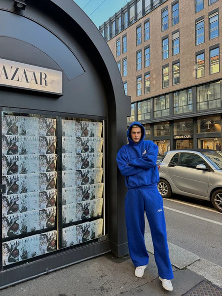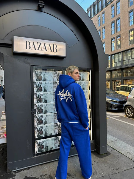 THE PUFFED SET IN BLUE consists of an oversized hoodie and wide-leg sweatpants. The hoodie has puffed print both at the front and the back. The former is a puff print of the letters A and أ in white. The latter is a puff print of the words "Asili" and "أصيلي" in white.
