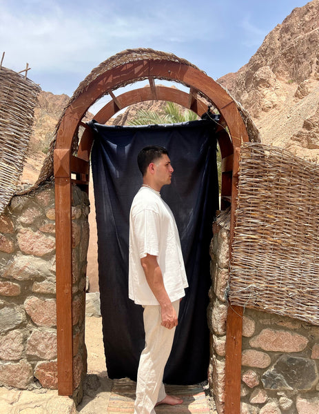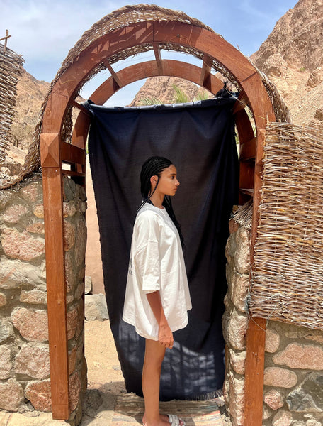 The QUESTIONING T-SHIRT is a sugar-white oversized short-sleeved t-shirt. The T-shirt has a sugar-white embroidery of the word "أصيلي" on the front. While from the back there is a grey print of the word "أصيلي" and on top of it the question "ARE YOU WHERE YOU WANNA BE YET?"